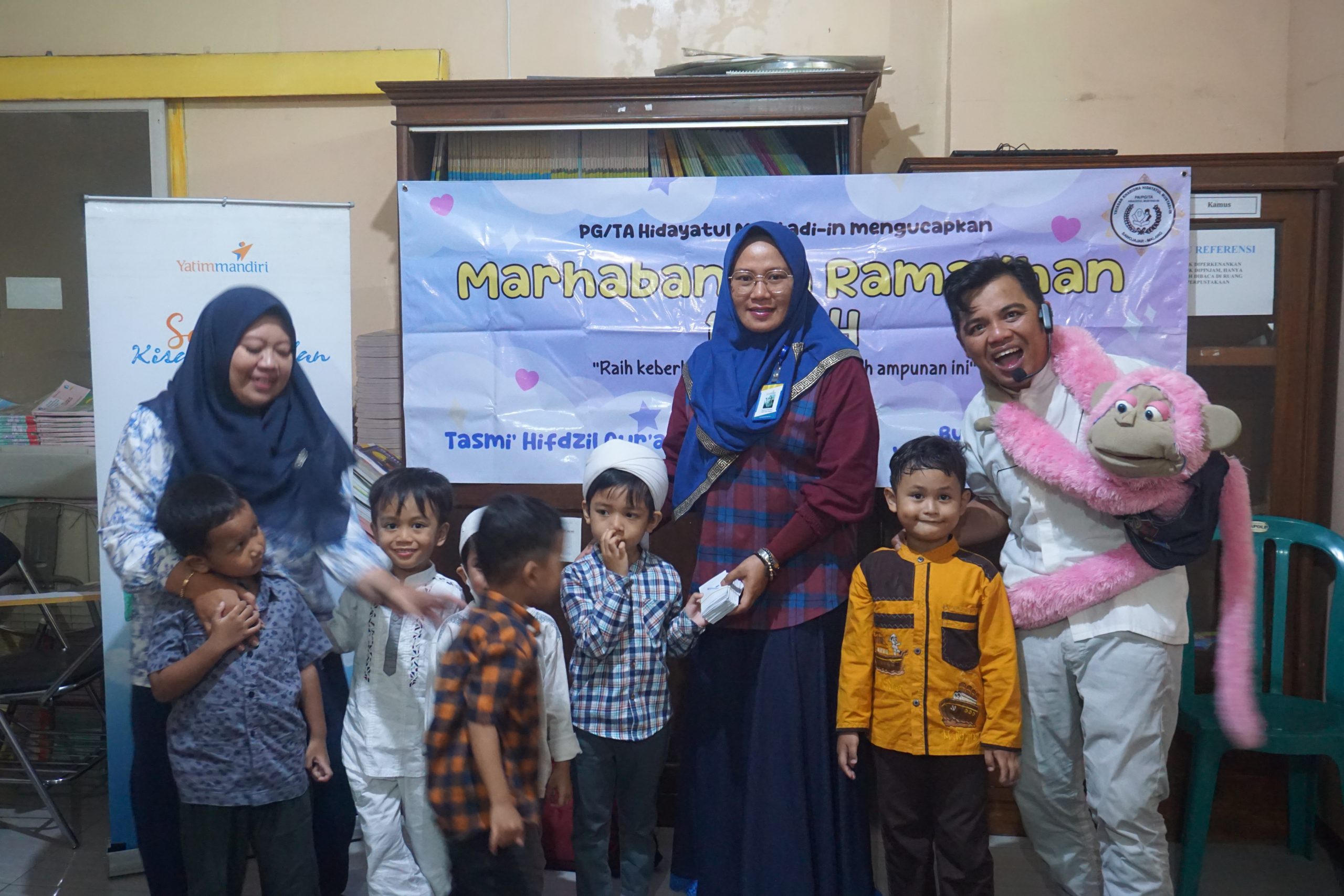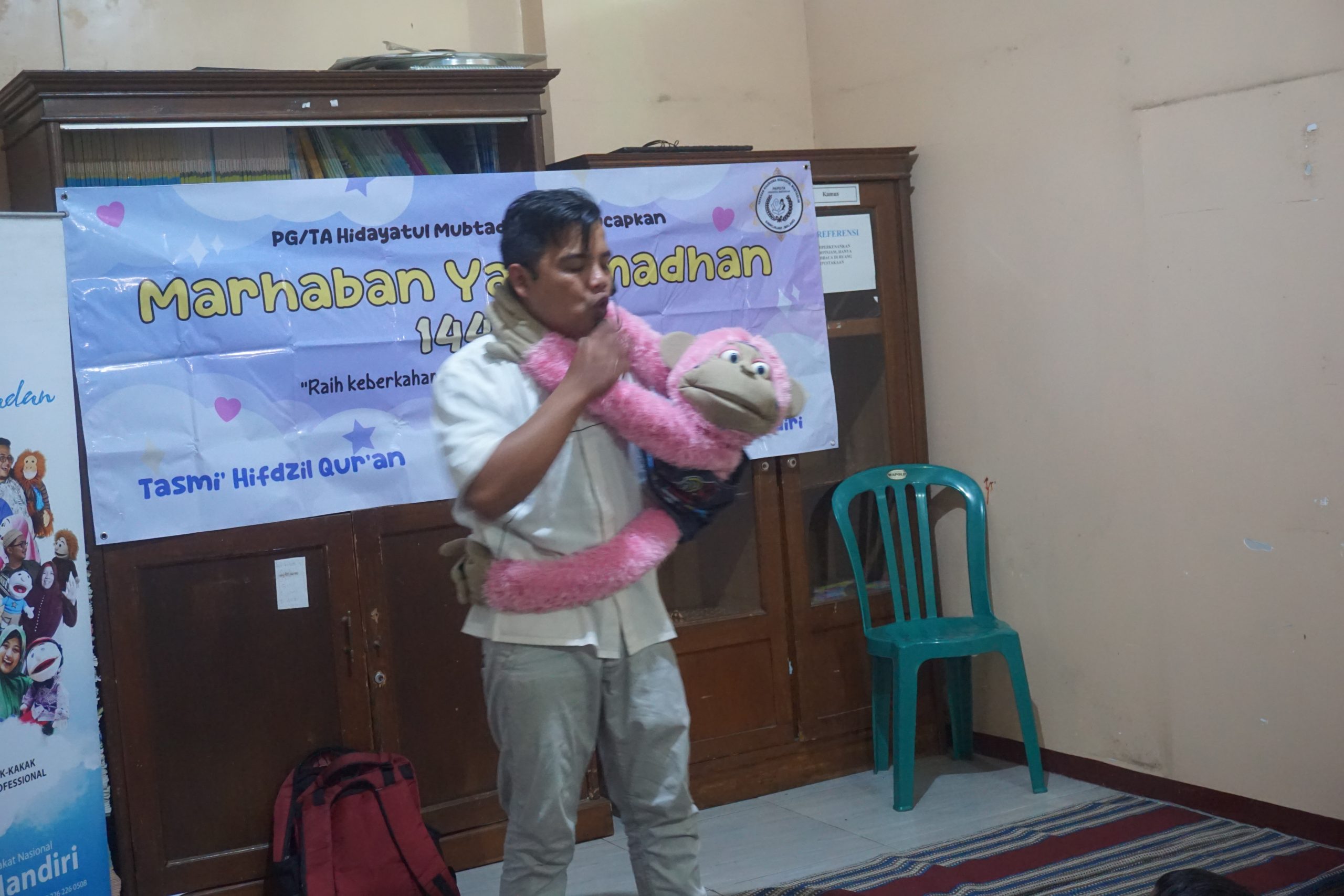 Acara buka bersama ini dibuka dengan sambutan dari Kepala PG/TA Hidayatul Mubtadi-in, Bu Siti Nuryana. Seperti biasa, sebelum beranjak ke inti acara, mari kita biasakan dengan membaca doa, setelah itu dilanjutkan dengan pembacaan ayat suci Al-Qur’an oleh guru kita yaitu Bu Safeya. Saatnya yang ditunggu-tunggu, kita bertemu lagi dengan Kak Edi dari Yayasan Yatim Mandiri dan teman baru kita, Tesi, si monyet pink yang lucu.